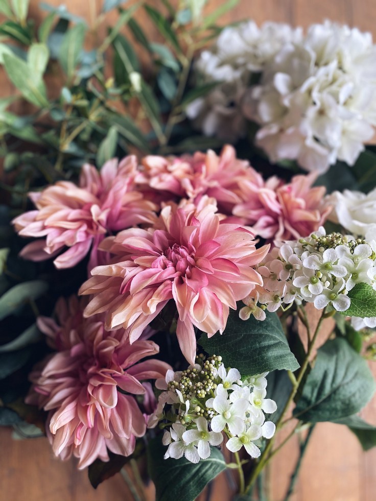 ….but as autumn approaches and the garden is put to bed I still want to have flowers and foliage around the house. That’s where faux flowers play their part. There are so many realistic ones available that you can literally have the essence of summer in your home the whole year round. I actually like to pick faux flowers that fit with the seasons, so autumn blooms such as dahlias, chrysanthemums and hydrangeas can be great to gather in a display.