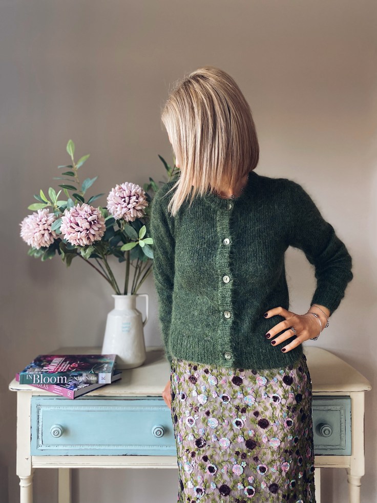 Mohair round neck cardigan in Moss @Brora & Liberty Print @Brora face mask @Brora (Ad/Pr Gift) / Coast Tumble jewellery @KitHeathJewellery (Ad / Part of current paid partnership)